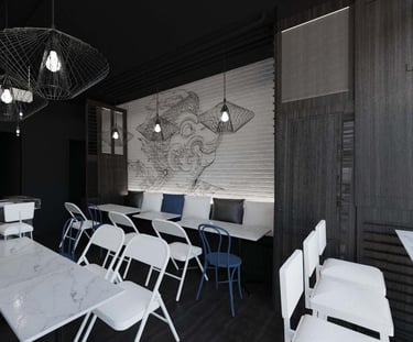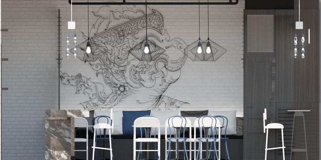 Concept B: This option offers a modern, sophisticated dining experience while integrating aspects of Thai culture. It draws inspiration from Thai mythology for decorative wall art and features hints of Thai-style architecture in the millwork and walls.