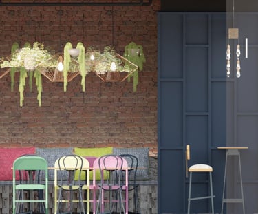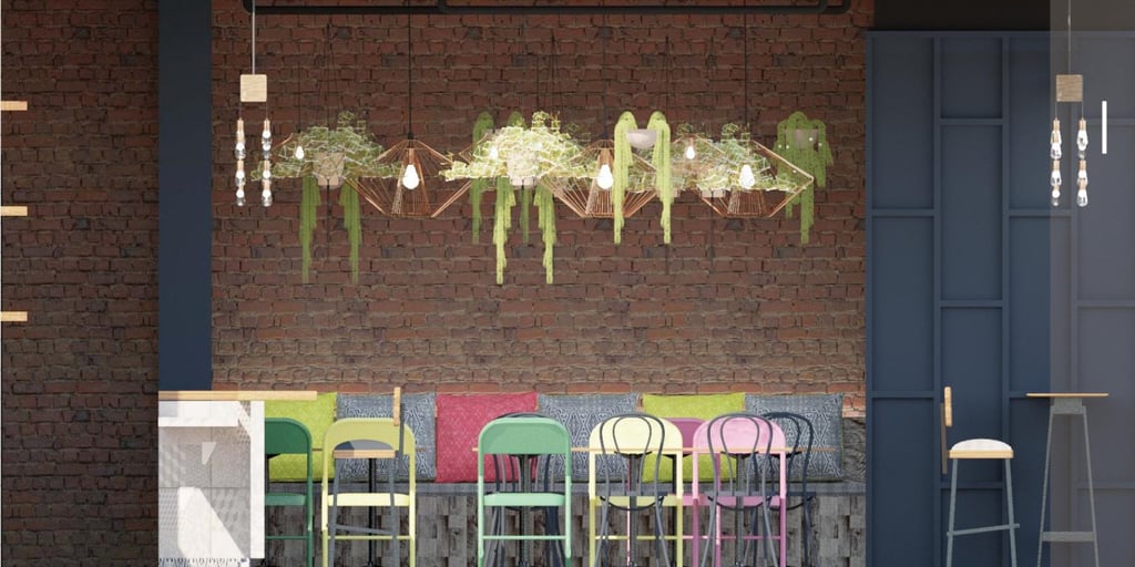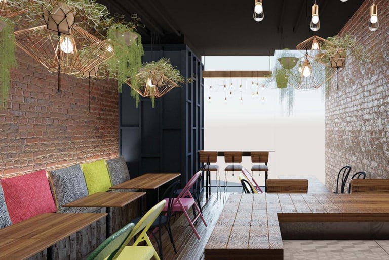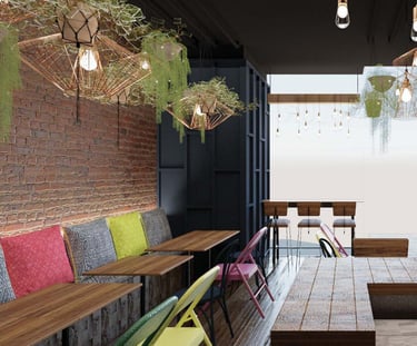 Concept A: This option creates a warm and cozy, home-cooked atmosphere, incorporating elements of Thai architecture and design through millwork patterns and fabric upholstery.